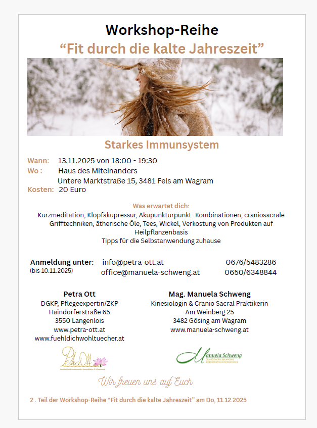 - Vorträge & Workshops auf Anfrage (z. B. Körperanwendungen, Gesundheitsförderung)